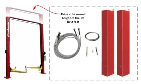 “2 Ft. Column Height Extension Kit For Model Le12. Includes New Length Cables, Hydraulic Hose, And All Necessary Hardware, Lift Height With Extensions. When Purchased Separately From Lift, Serial Number And Lift Color Are Required To Place Order.”