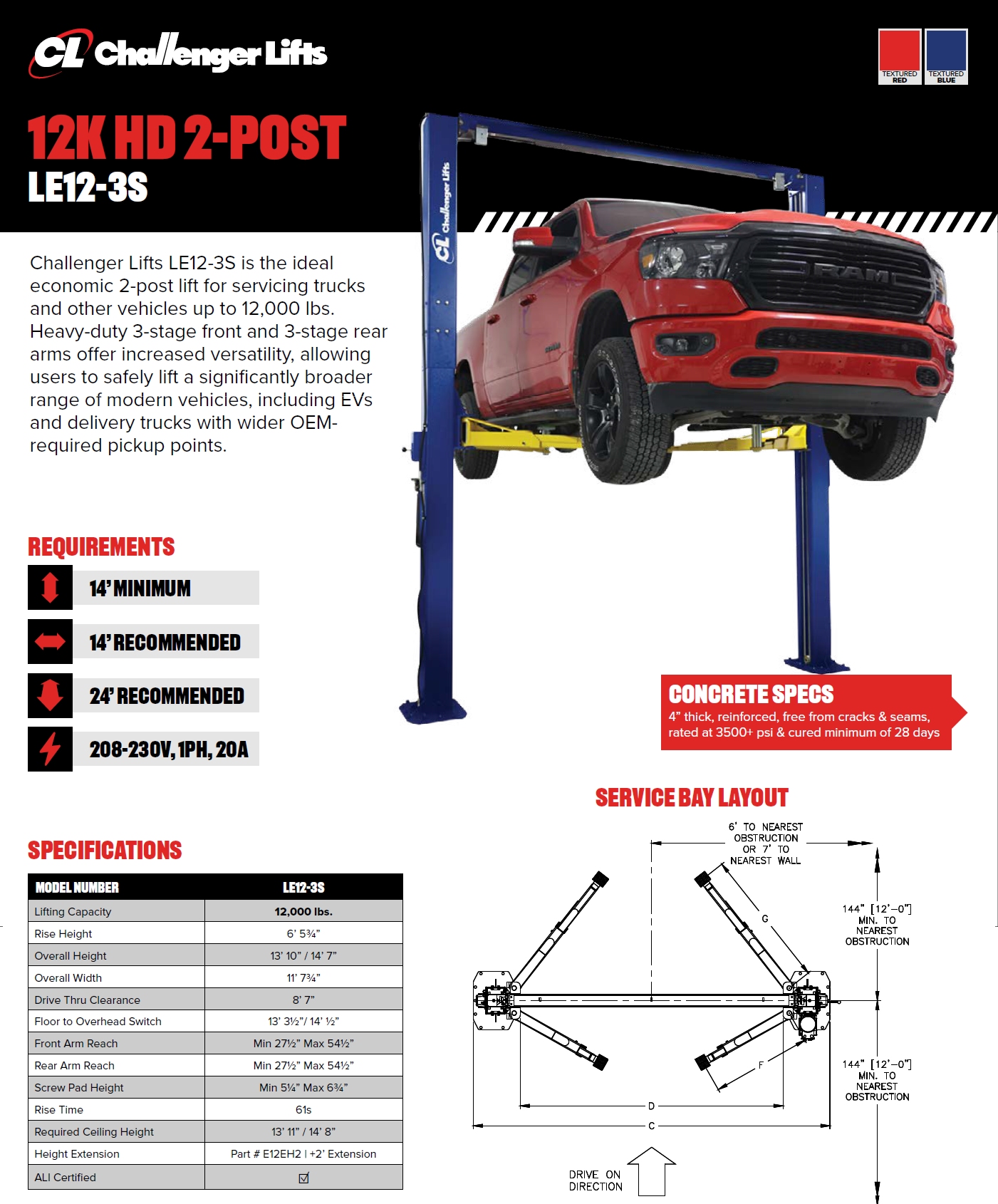 Challenger Lifts LE12-3s is the perfect economic 2-post lift for servicing trucks and other vehicles up to 12,000 lbs. Heavy-duty 3-stage front and 3-stage rear arms offer symmetric lifting capability. Also, adjustable column height accommodates higher profile vehicles while providing ample servicing headroom. The LE12-3s comes standard with stack adapters. Accommodate higher profile vehicles with optional 2 foot column extensions.
