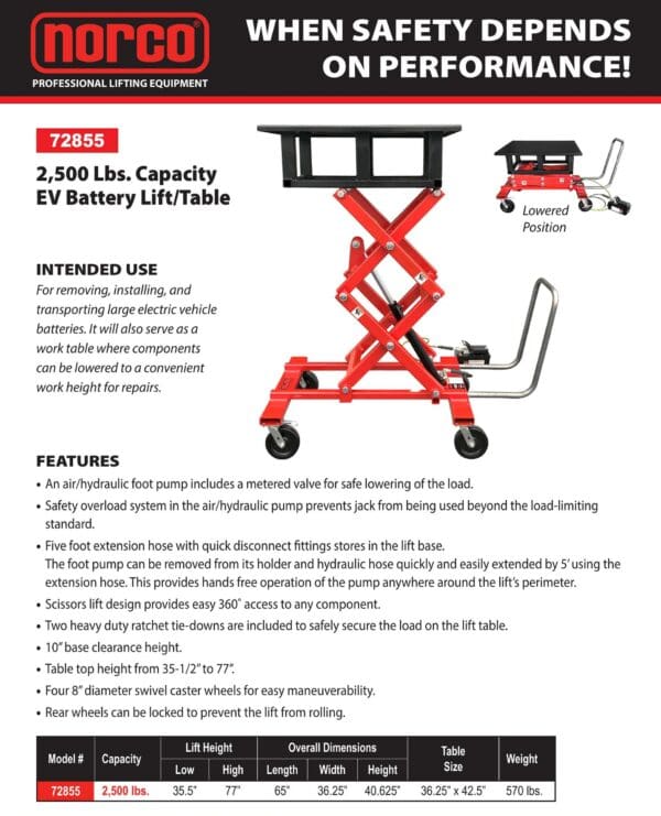 For removing, installing, and transporting large electric vehicle batteries. It will also serve as a work table where components can be lowered to a convenient work height for repairs.