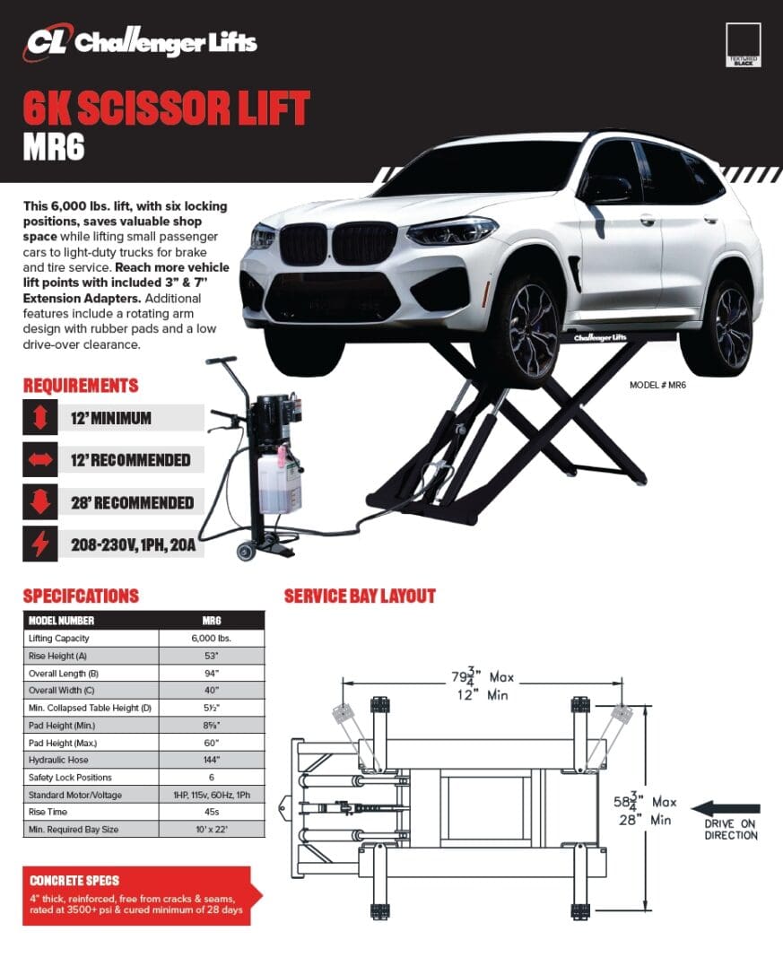 Challenger’s midrise lift is a great way to increase the productivity of any shop. We mounted the motor to a heavy-duty tow dolly, making it portable and able to operate on concrete, indoors, or out. Save valuable shop space while servicing brakes, tires or detailing a vehicle’s exterior. The 6,000 lb. capacity will lift vehicles from small passenger cars to light trucks.