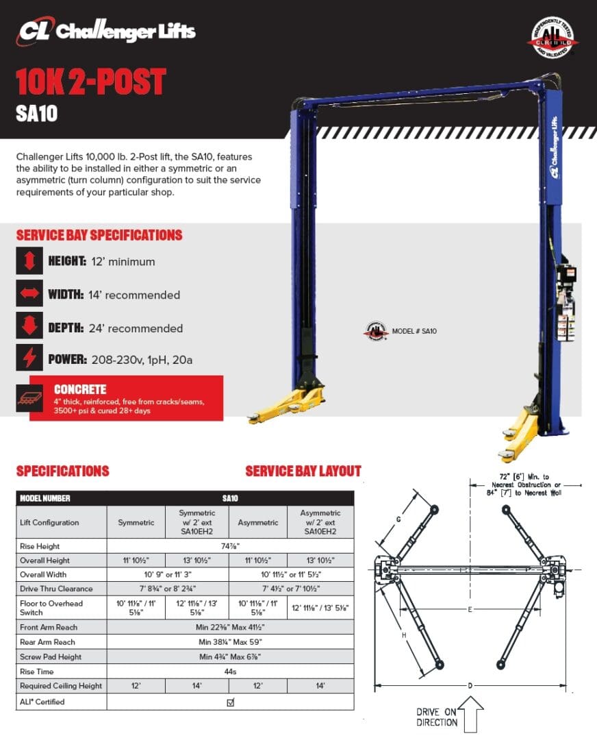Challenger’s SA10 2-post lift offers 10,000 lb. capacity. You can install the SA10 in either symmetric or asymmetric position, depending on your service needs. The SA10 also features adjustable height and width options to further customize it to meet your needs. Innovative 3-stage front and 2-stage rear arms provide greater overall sweep.