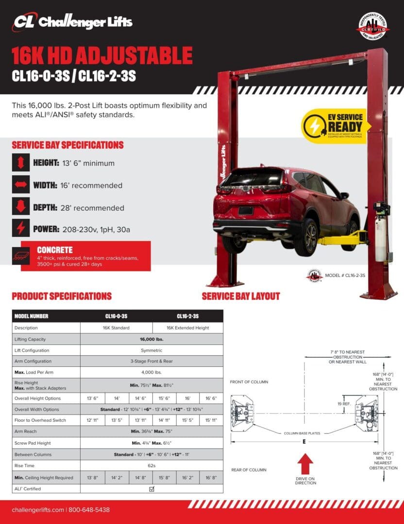 Challenger’s 16K Heavy-Duty Two-Post lift offers unparalleled flexibility and safety, making it the ultimate partner for all your automotive needs. With a capacity of 16,000 lbs. and featuring 3-stage arms, this lift can handle a variety of vehicles, from select standard cars, trucks, and SUVs to most Electric and commercial-fleet vehicles. It also features low-profile pickup pads, along with multiple height and width options. You can install this lift to ensure your shop can efficiently service even the widest variety of vehicles.