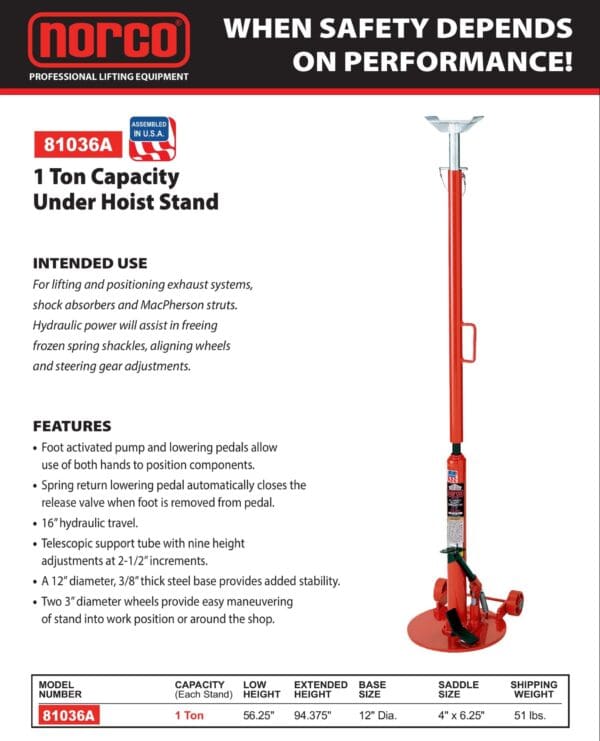 Under Hoist Stand, 1 Ton, Hydraulic Jack, with Wheels (Norco: model 81036A)